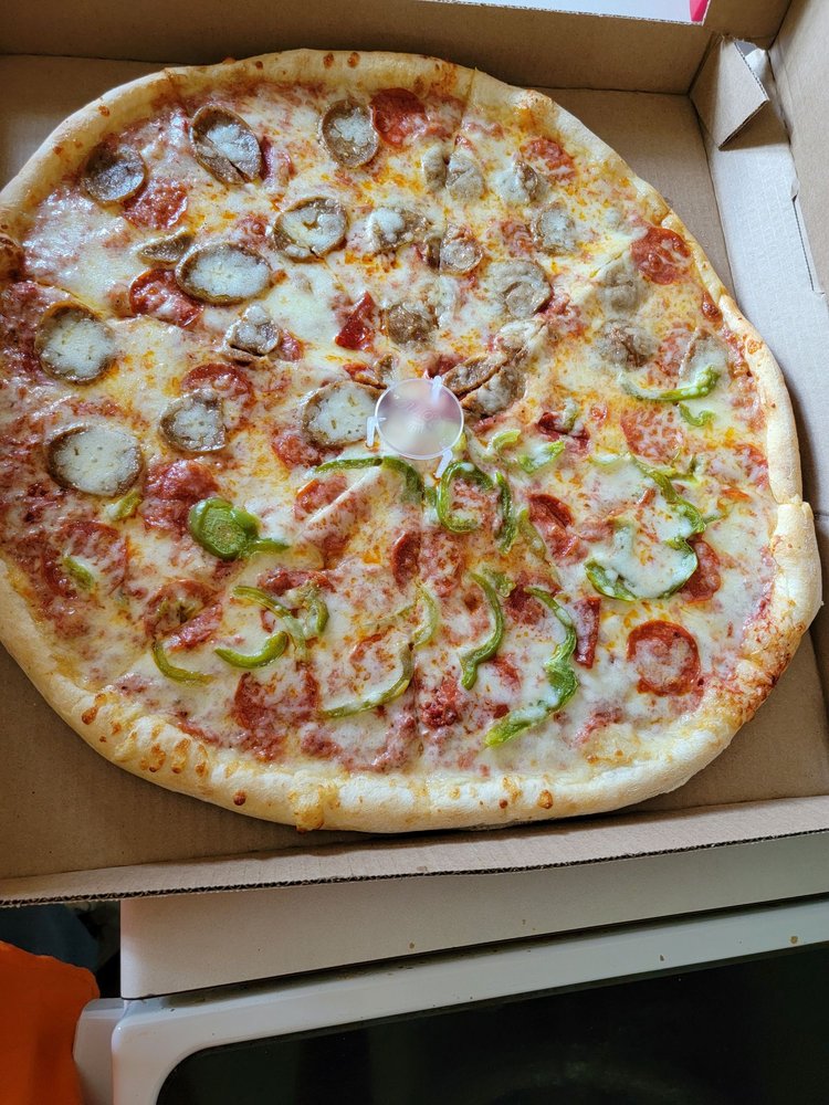 Pepperoni, Canadian bacon, black olives, green peppers, onions, mushrooms and extra cheese.